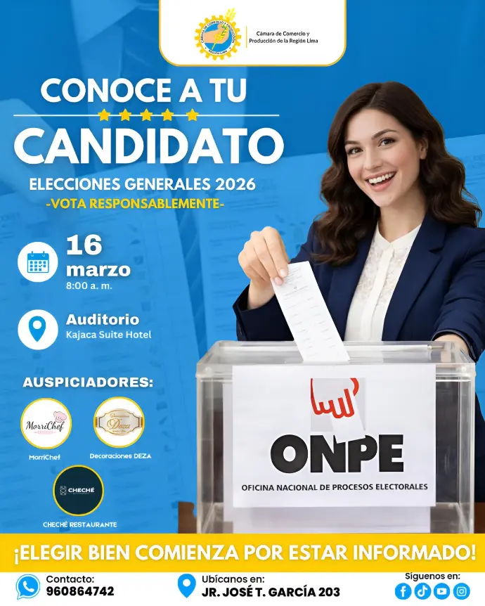 La Cámara de Comercio y Producción de la Región Lima te invita al evento central “Conoce a tu Candidato – Vota Responsablemente”, un espacio institucional que promueve el análisis, el debate alturado y el voto consciente rumbo a las Elecciones Generales 2026.